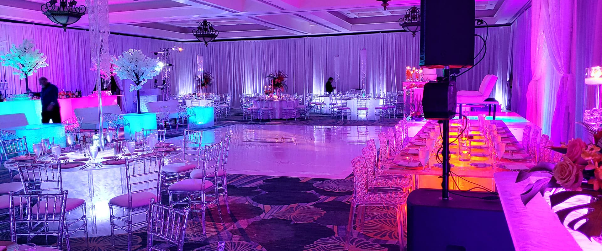 Standard with our Diamond Package, your wedding will engage your guests with a visual display that coorindates with every part of the reception. Our lights will set the mood as guest enter, spotlight all eyes onto the dance floor for your first dance while also being able to electrify the room when it’s time to party!